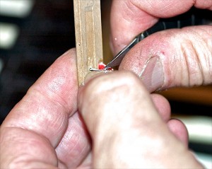 If the spring is missing or if you wreck one, pop down to your local shop and rummage through the expensive paintbrushes to find one with hairs of a similar diameter, and plenty long enough, to those on a complete and working jack. Now you have a moral dilemma, should you buy the whole brush or just snip a few hairs off!!!???  The hair is inserted into the hole in the back of the jack up towards the tongue, almost to the top of the jack. then the lower bit is bent again using the back of the scalpel blade and fed through the hole that goes down through the jack to appear at the front. From here it is pulled through until the spring is the right length; cut off the excess bit you pulled through.