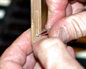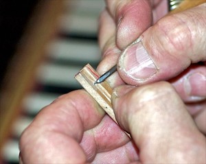 Assuming that the instrument is strung and tuned roughly to the pitch for which it is designed, the next stage in setting the action prior to voicing is to fit all the jacks into their respective positions. This is best done before fitting the plectra (or the tongues where these can be easily fitted later). When quilling a new instrument with wooden jacks and real feathers, the operation of quilling is done before the jacks are fitted to the guides: the quills are cut off against a block to leave about 12mm protruding, and the order of the jacks in the row is then determined by feeling the strength of the quills with the fingers: the strongest quills are in the bass. When re-quilling an older instrument, the jacks are already numbered and so the quilling requires greater care and experience.