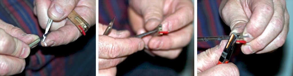 (d) If the spring is too weak, it can be made effectively stronger by inserting the tip of the scalpel between spring and tongue, edge towards the tongue, just a few millimetres below the top end of the spring, and press the spring over the back of the blade to bend it, this often works.